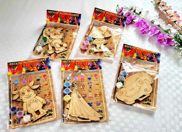 Розфарбуйте відомих героїв з казок. У набір входять фарби в різних кольорах і кісточка.