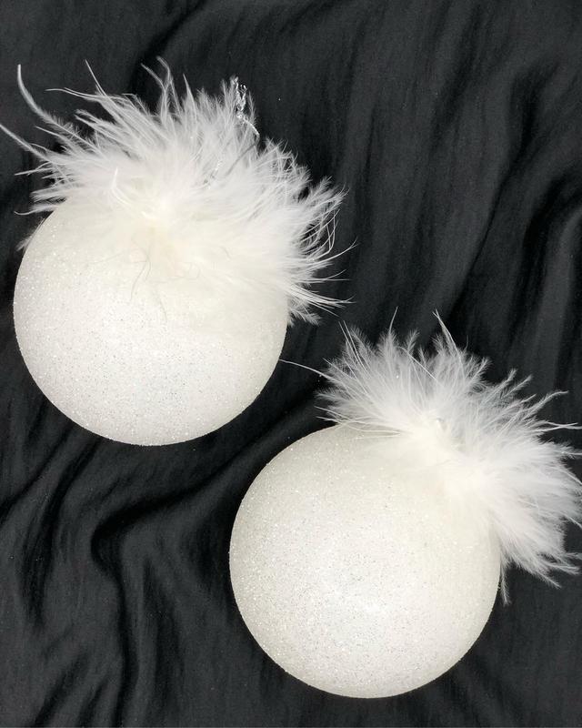 Красиві новорічні кульки з пір'ям 10см в наявності різні розміри і кольори. В упаковці 6 штук.