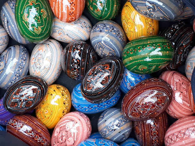 Виготовлені на Гуцульщині, ці декоративні яйця з дерева мають гарний вигляд завдяки майстерності виробників. Народні умельці вирізають з натуральної деревини виробу у формі яєць розміром приблизно 10-11 см і розфарбовують їх тематичними візерунками. Насамкінець кожен виріб покривається лаком.